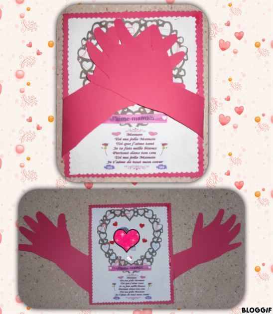 Tia bientot 2 ans m'a prêté ses bras et ses mains pour faire cette jolie carte...elle a dessiné sur les coeurs et au milieu nounou a collé une photo de tia faisant un bisous à sa maman .....merci ma puce..