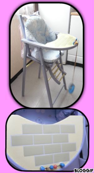 Pendant mes vacances j'ai repeint ma petite chaise de bébé, j'ai eu l'idée de mettre sur la tablette les carrés autocollants que l'on utilise pour les murs de salle de bain.